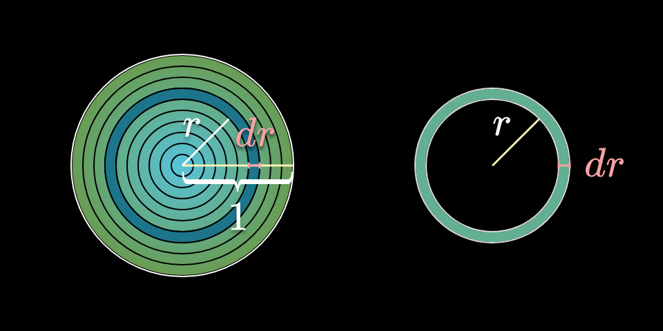 取其中一个圆环,其半径 r在 0 到 1 之间。厚度为 \mathrm{d}r(为体现微积分标准符号的思想),表示从一个环到下一个环的半径的微小差异。