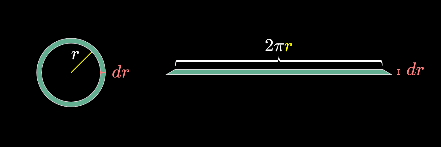 我们不妨将其拉直,并将其近似于矩形(长 2 \pi r,宽\mathrm{d}r)。这个矩形的面积是 S = 2 \pi r \ \mathrm{d}r