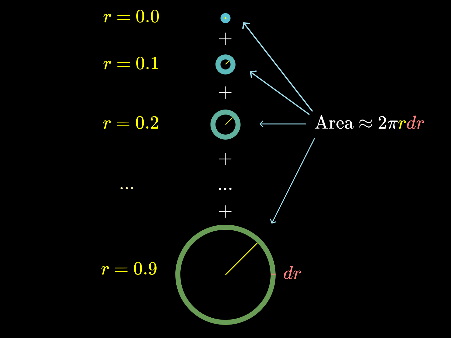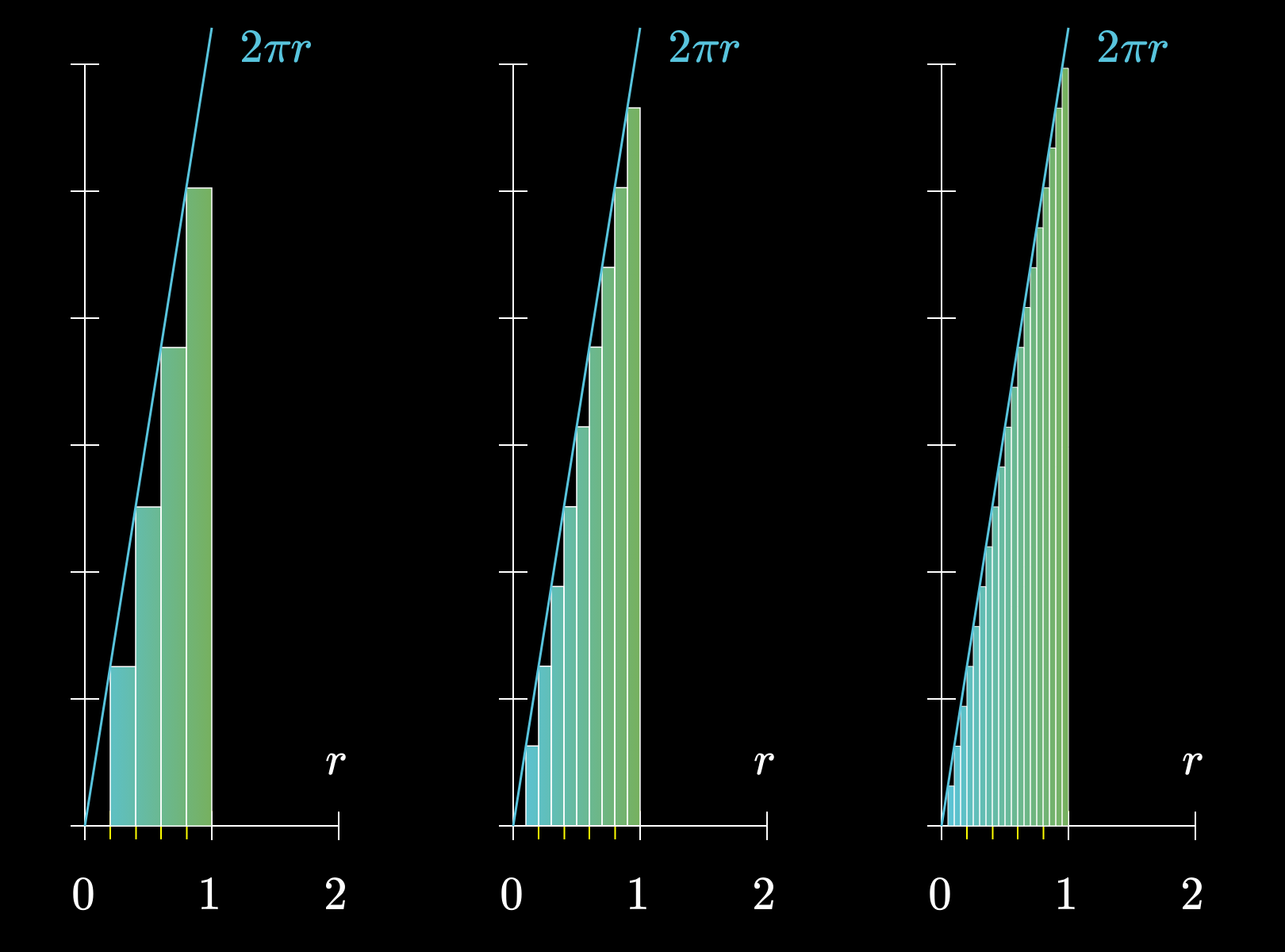 每一个的厚度都是\mathrm{d}r,且对于每一个r的取值,位于其上长方形的高均为2 \pi r。