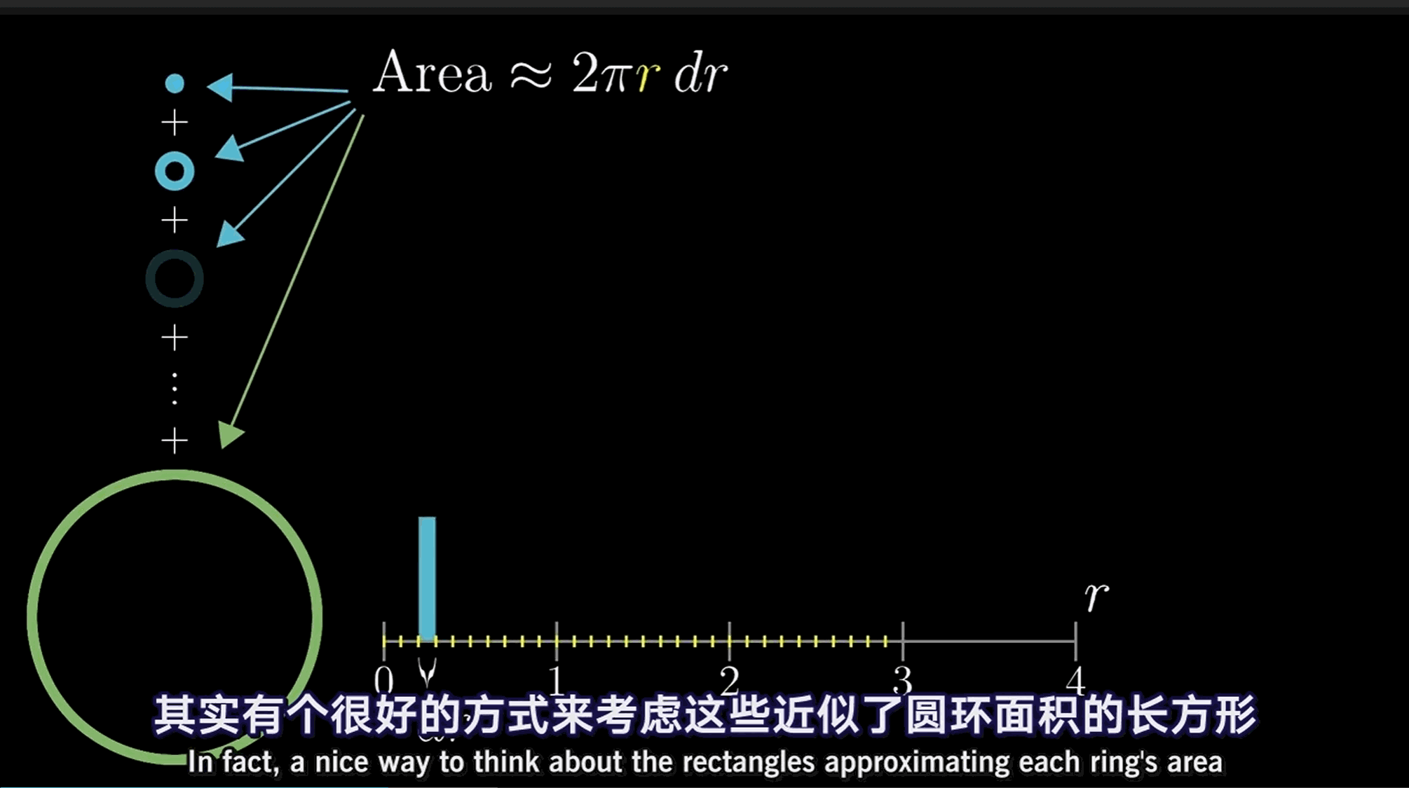 尽管我们选择的矩形和其实际形状(梯形)之间有一些面积差距,但当\mathrm{d}r越来越小时,这个提醒上下两条边将愈发趋近于统一长度,该面积误差也将越来越小。
